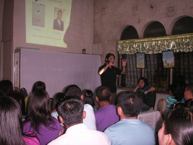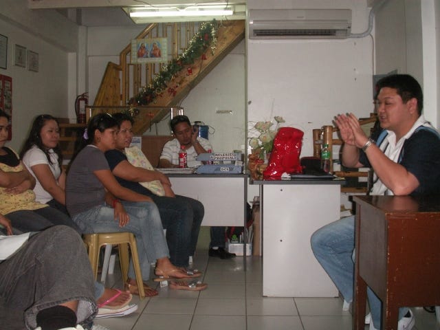 On Saturday we showed up 30 minutes late for a 9:00 AM start time. This time, the staff from five branches from across Cebu came to hear the presentation. Sixty people crammed into a room to hear us talk. I kicked things off with the first presentation, shortening things up and distilling the essence of Kiva into easily understood analogies, though I think I failed again to convey the message. Over the course of the next six hours, the other four, including Jubert, made their presentations while the rest of us struggled to stay awake.