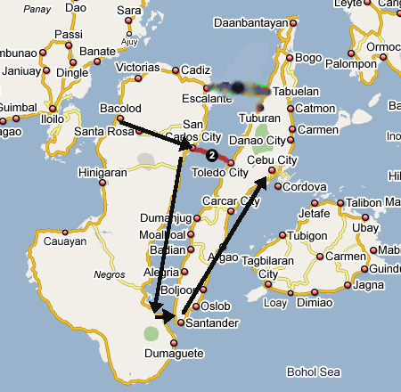 This weekend I went to Cebu, an island east of Negros, for the Kiva rollout in the NWTF branches. I figured the place would be ideal for my photography, especially since I’d gotten hold of the best dslr under $1000 that one could lay their hands on. I traveled as part of a five-person team, including Massah, the photography consultant, Raymond, the research manager, Jubert, the IT manager, and Presy, the Kiva coordinator. Pocholo, a friend of Raymond’s, needed a lift to Cebu and caught a ride with us. The six of us loaded the infamous red van and left at 7 AM on Thursday morning. The road to the port in San Carlos normally takes 3.5 hours, but we chose to take a shortcut through the mountains on a winding two-lane road cut neatly into the side of a cliff. Unfortunately, by the time we arrived at the port, the ferry was full. The next ferry didn’t leave until 2:30 in the afternoon, so we drove three hours south along a coastal road to another port in Aclan, where the ferry leaves every hour and takes 30 minutes to cross. Once on the other side, we had another three-hour trip back up north. Twelve hours later, we arrived in Cebu City and checked into a hotel.