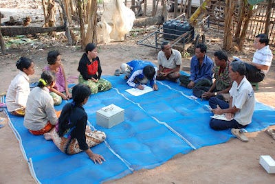 Saving for Change, a microsavings organization started by a former microfinance practitioner, offers a solution to this problem. The program, which is being implemented in Mali, Cambodia, El Salvador and Senegal, helps the rural poor to form and operate savings groups and provides training on financial literacy and basic accounting. The groups elect their own officers; create participation guidelines and bylaws; and determine their weekly savings amount, loan interest rate and record-keeping mechanisms. The program is adaptive – for example, some non-literate groups have devised an accurate oral accounting system based on group memory and counting sticks or rocks). Participants in the program are able to save enough to purchase inventory for a store, pay for school fees, purchase seeds for planting or a cow for labor, or buy a plot of land to build a house. If a member needs a large sum of money quickly, they can borrow it from the group’s fund. By repaying the loan and added interest, they contribute to the growth of the communal savings, which is disbursed to the group members at the end of the saving cycle (which can be timed to coincide with a period when all the group members need more money, such as when food is scarce or before a major festival).